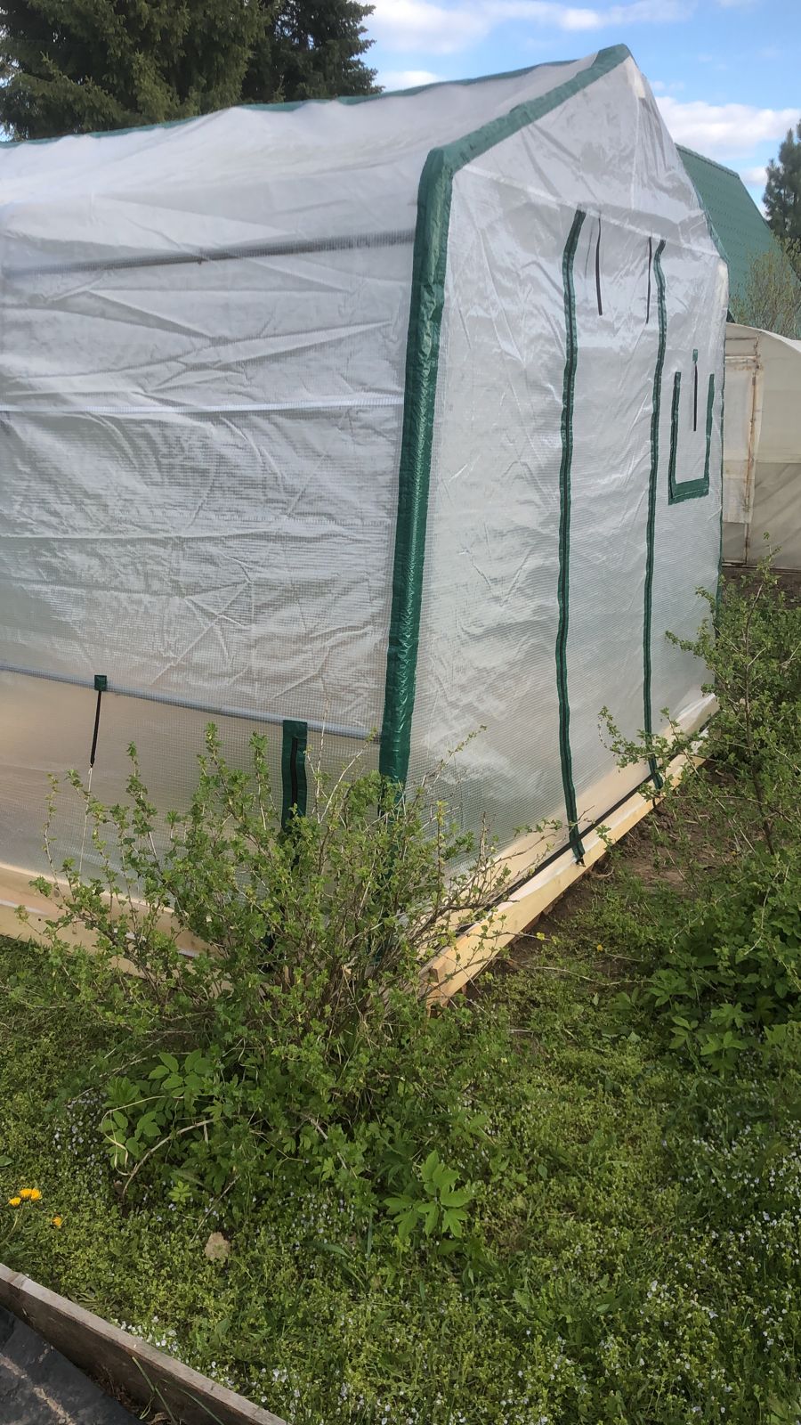 По низу добавлен материал пленки, чтобы чехол доставал до земли. Но все равно мы рекомендуем обустроить низ теплицы фундаментом из бруса или толстой доски, чтобы было к чему крепить и прижимать чехол.